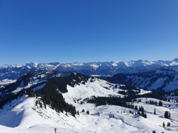 Heute steht die „Königsetappe“ auf dem Programm. Mit der Bergbahn geht’s hinauf in die verschneite Hörnergruppe. Von dort führt uns unser Bergführer über glitzernde Grate, durch lichte Wälder und hinauf zu gleich drei Gipfeln – Sigiswangerhorn, Rangiswangerhorn und Ochsenkopf.