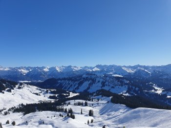 Die Sonne glitzert auf der Schneedecke, und im Süden reicht der Blick bis zu den Schweizer Alpen. Beim Abstieg kehren wir in der urigen Mittelalpe ein – deftige Brotzeit, duftender Tee, Lachen, rote Wangen – Wintergenuss pur.