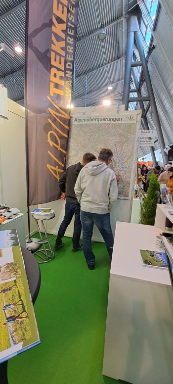 Unser Messestand war einladend und authentisch. Ein Highlight des Standes war eine große Topo-Karte, auf der die Gäste unsere beliebtesten Touren einsehen und sich über diese informieren konnten.