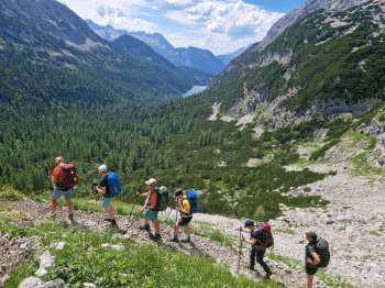 Nach zwei Tagen in luftiger Höhe hieß es heute Abschied nehmen. Der Abstieg führte uns über das Bockkar und weiter durch das wildromantische Bacherloch – eine der ursprünglichsten Landschaften der Allgäuer Alpen. Der Kontrast war faszinierend: Von felsigen Höhen stiegen wir hinab in grüne Täler, bis schließlich die ersten Bäume auftauchten.