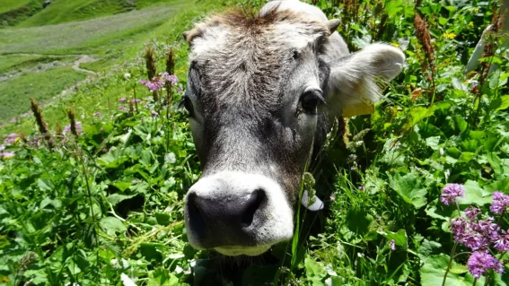 Der Abstieg verläuft über einen panoramareichen Pfad, vorbei an imposanten Felsformationen und traditionellen Kuhweiden, bis wir wieder unseren Ausgangspunkt erreichen.