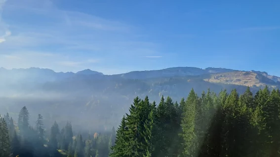 Vom Gipfel folgt der Abstieg über einen zunächst offenen, später zunehmend bewaldeten Hang. Ein ruhiges Waldstück begleitet dich sanft hinunter zur Mittelalpe, wo sich eine kurze Rast anbietet.